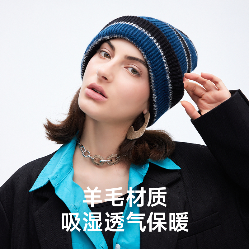 ohsunny羊毛针织冷帽春秋双面戴堆堆帽显脸小大头围毛线条纹帽子