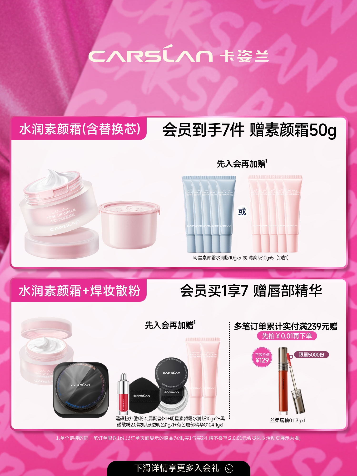 会员进直播间加赠明星素颜霜水润版10gx1+5gx1或明星素颜霜清爽版10gx1+5gx1,叠加11.04元淘金币,叠加400-40店铺券到手67.91