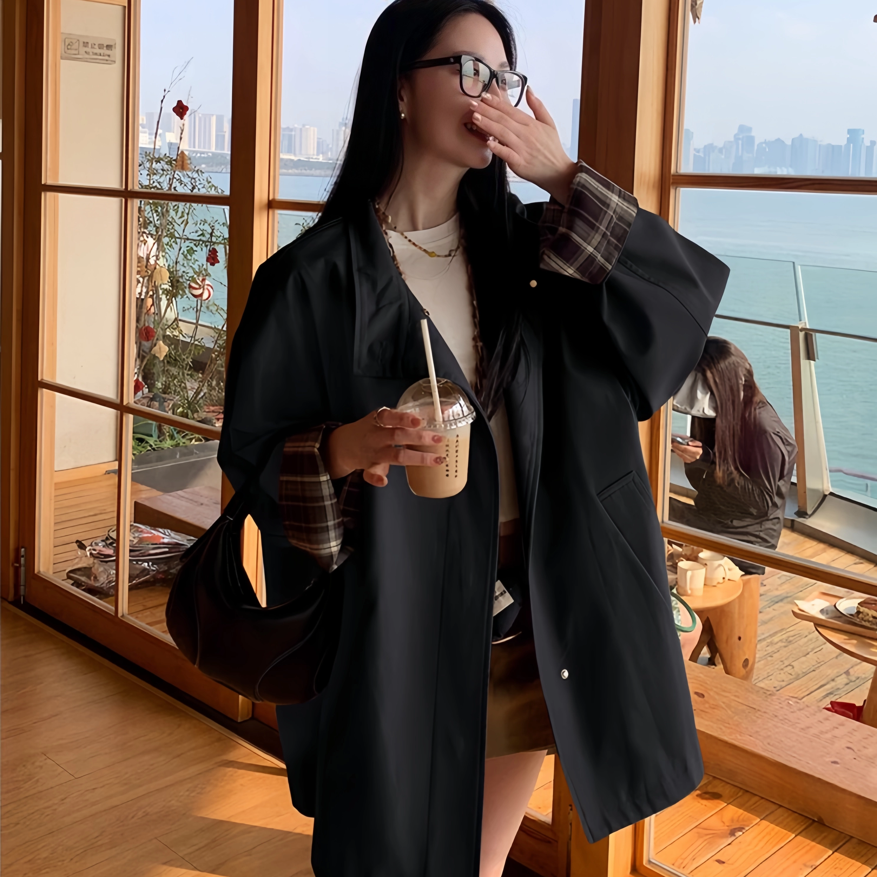 产品详情:FF格纹拼接工装风衣外套——撞色领口,解锁英伦高级感