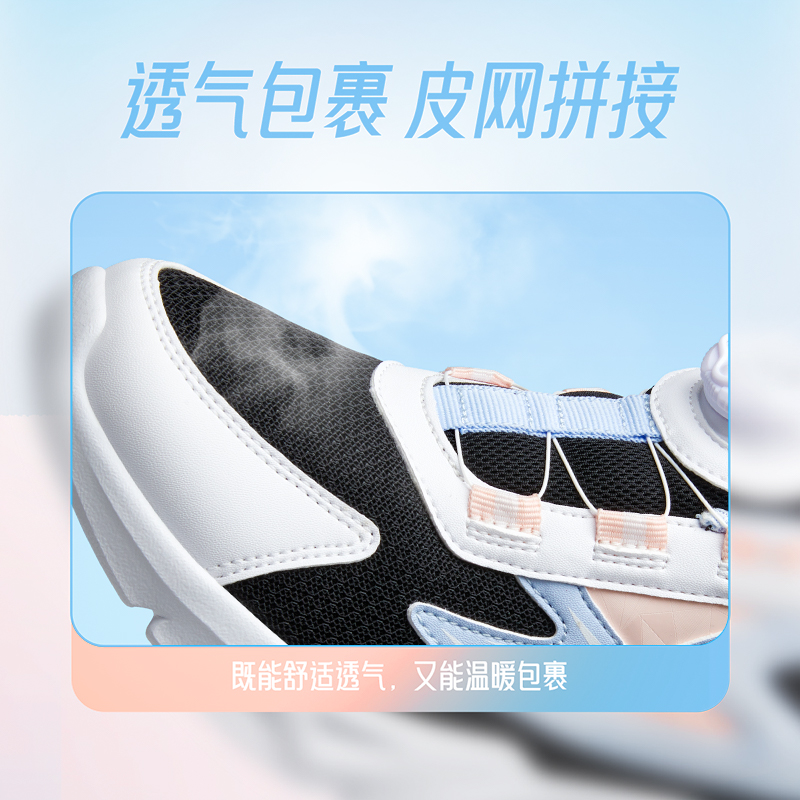鞋带系统:创新旋钮扣设计,单手3秒调节松紧,避免传统鞋带松脱风险,孩子自己也能穿脱。