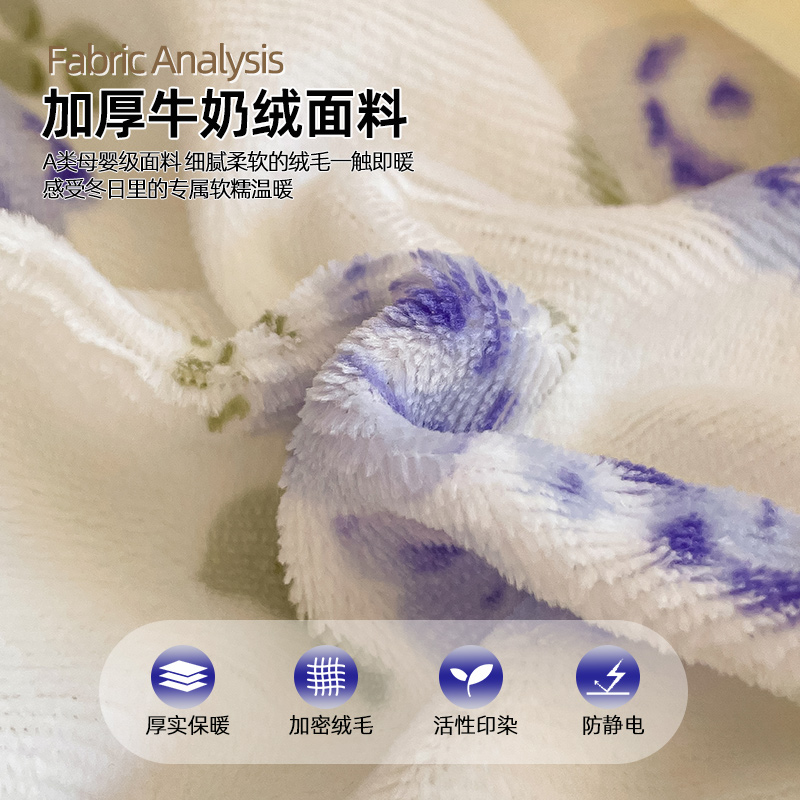 材质:采用A类母婴级牛奶绒(外层)+ 加密珊瑚绒(内层),双面绒设计形成空气保温层,升温速度比普通绒类快30%,裸睡级亲肤体验,无静电、不起球。
